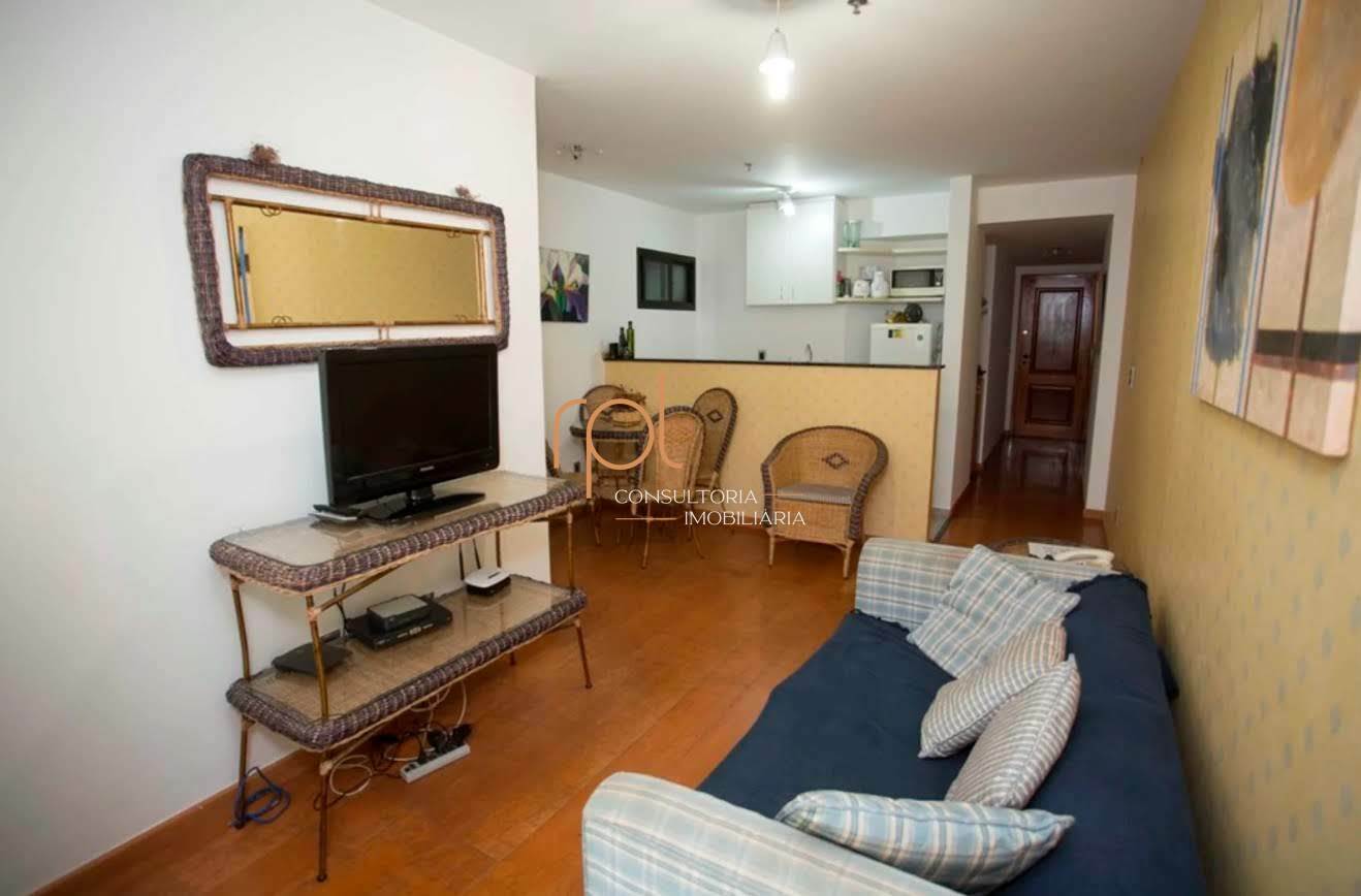 Apart hotel em Ipanema, na quadra da praia, próximo ao metrô, sala, quarto, banheiro e cozinha de apoio, com vaga. Apart com infraestrutura, salão de almoço, salão de festas, piscina, sauna e academia. Todo mobiliado.
